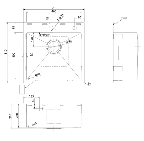 Lavello DeRicci HMS4640R10SS Serie Professional - Acciaio inox 51x51x21cm