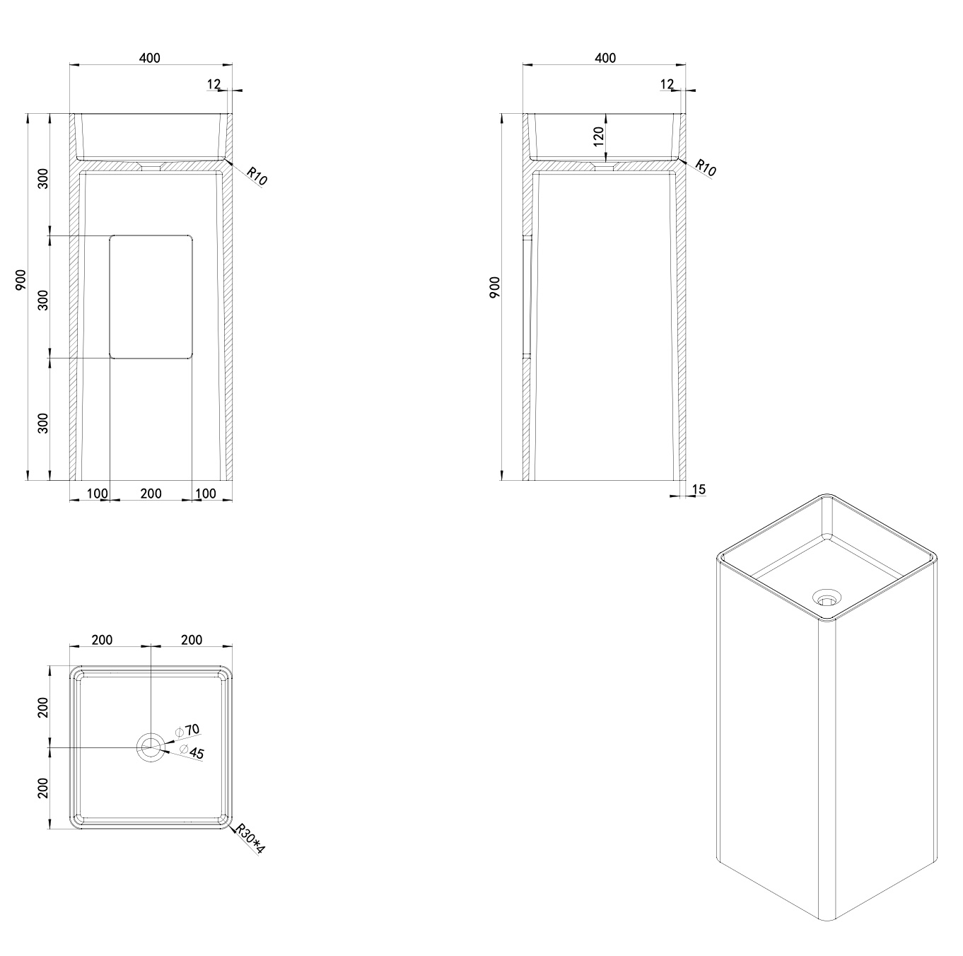 Dimensioni: 400 mm (L) x 400 mm (P) x 900 mm (H).