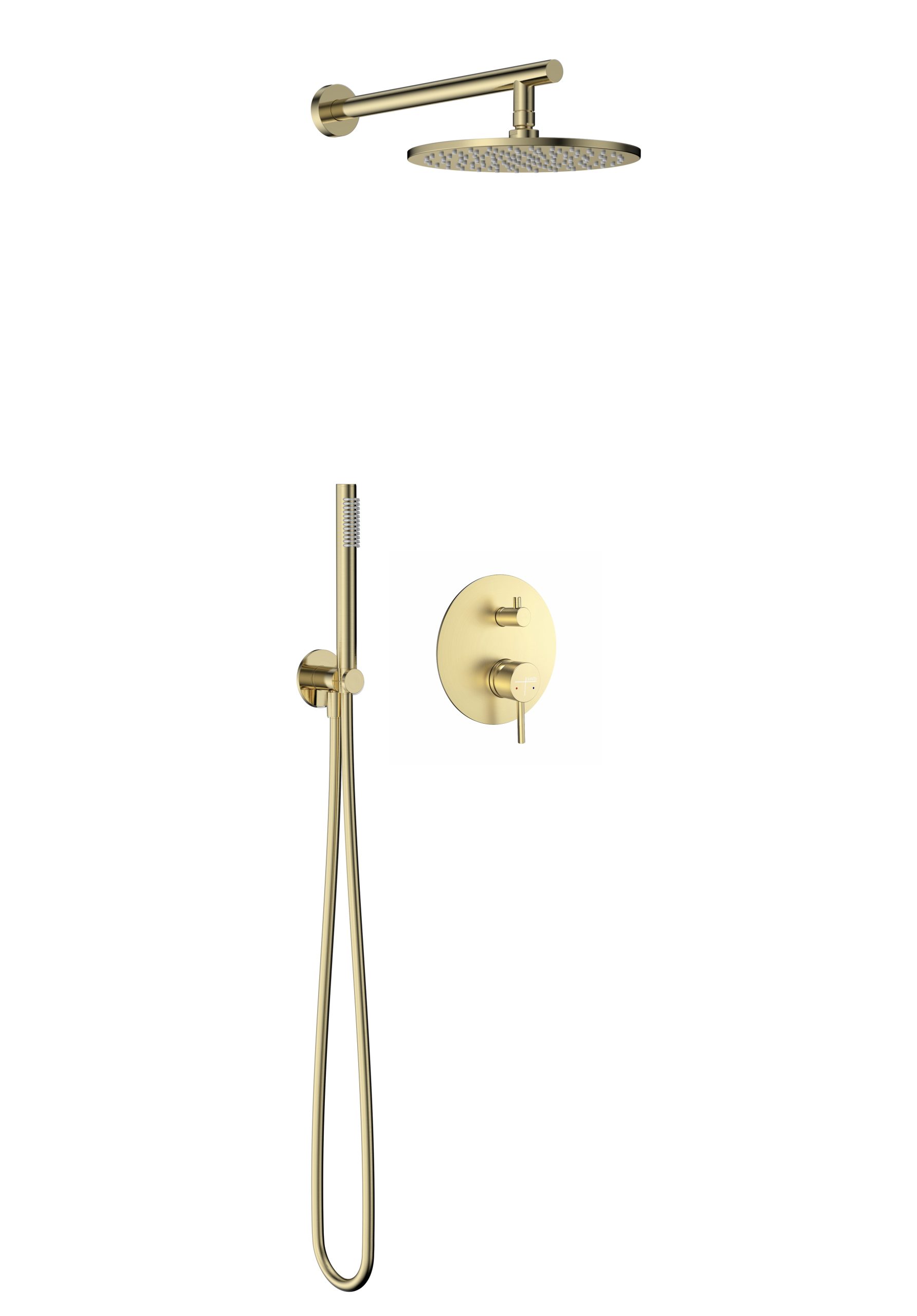 The circular wall plate features a simple manual lever for temperature control and a diverter knob to switch between the luxurious overhead rain arm and the handheld spray. Included is our signature color-matched Brushed Brass Smooth PVC hose, offering a seamless look that is soft to the touch and incredibly easy to clean compared to metal spirals.