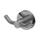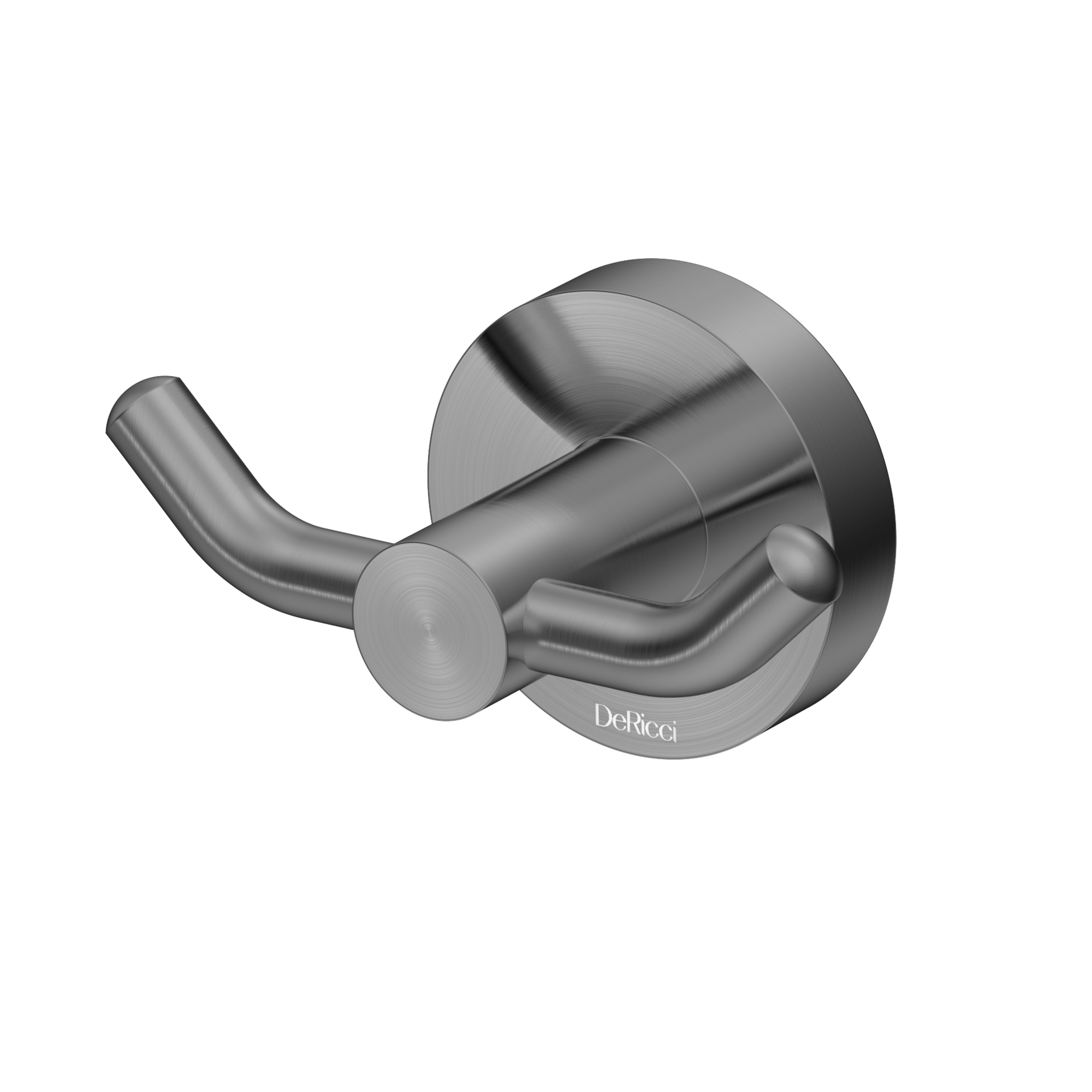 For a sophisticated, moody edge, choose the DeRicci Gunmetal Double Robe Hook. The dark grey, glossy metallic finish offers a striking alternative to chrome, perfect for industrial or luxury modern interiors.