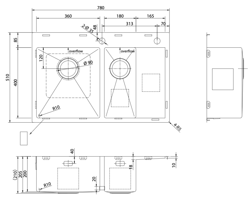 The design is crafted with precision R10 tight-radius corners, delivering a sharp, geometric look that maximizes bowl space and is easy to wipe clean. The sink floor is elevated by dual branded round drain covers that sit flush with the bottom, concealing waste fittings for a streamlined, hygienic appearance.