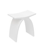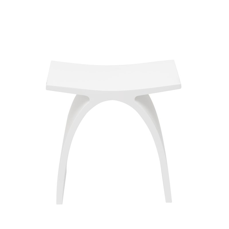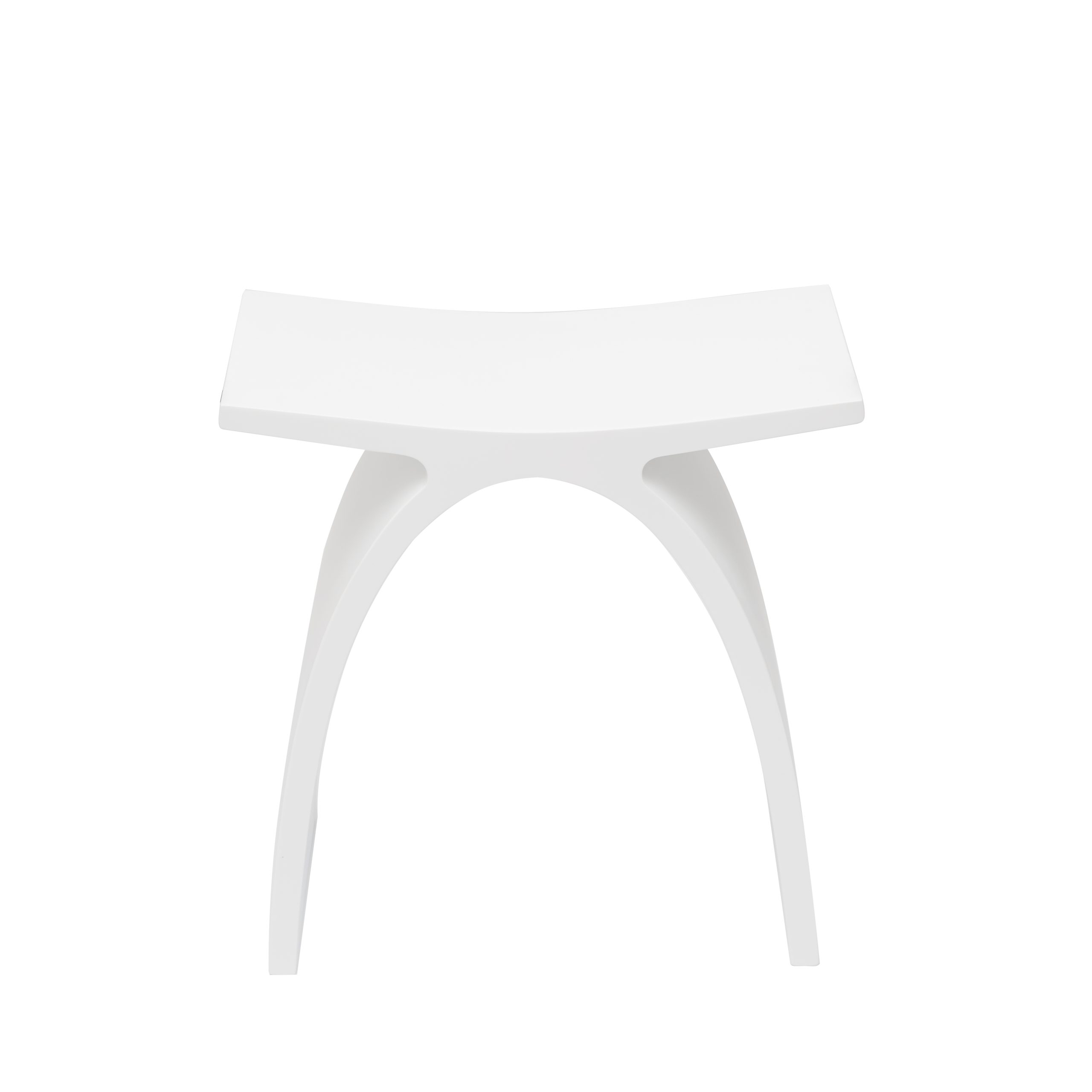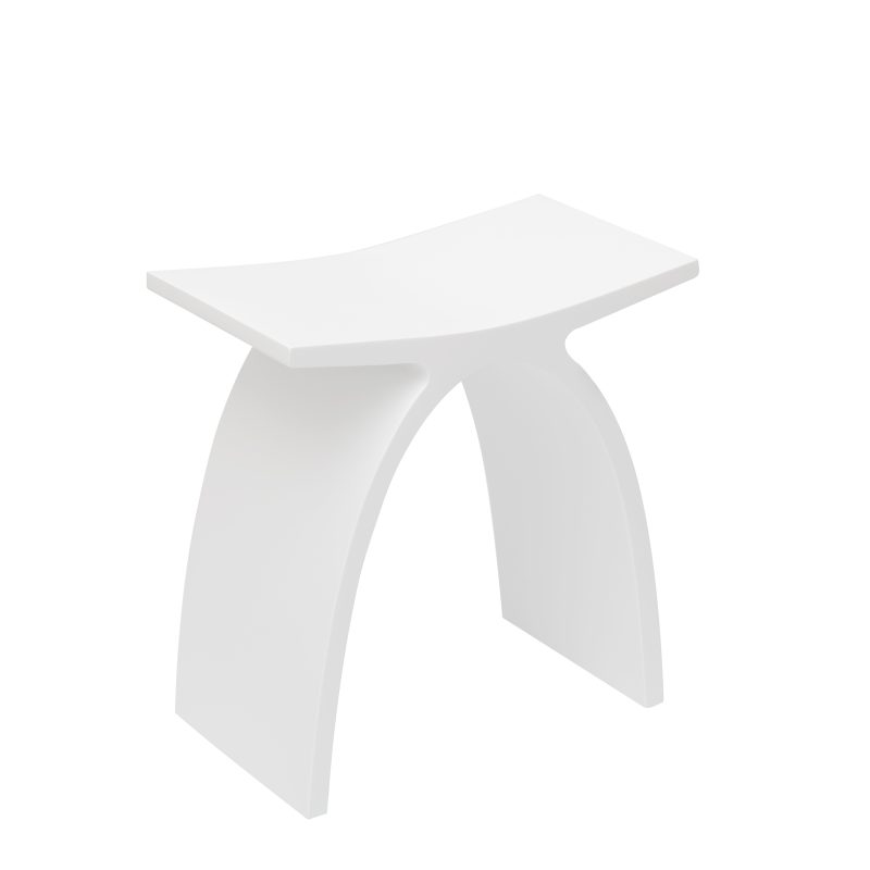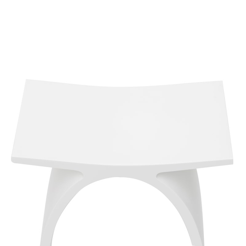 The chair features a gently curved, ergonomic seat resting on striking arched legs, creating a sculptural silhouette that enhances any modern bathroom. The matte white finish is soft to the touch, non-porous, and exceptionally durable, ensuring it withstands the humid environment of a shower without degrading.