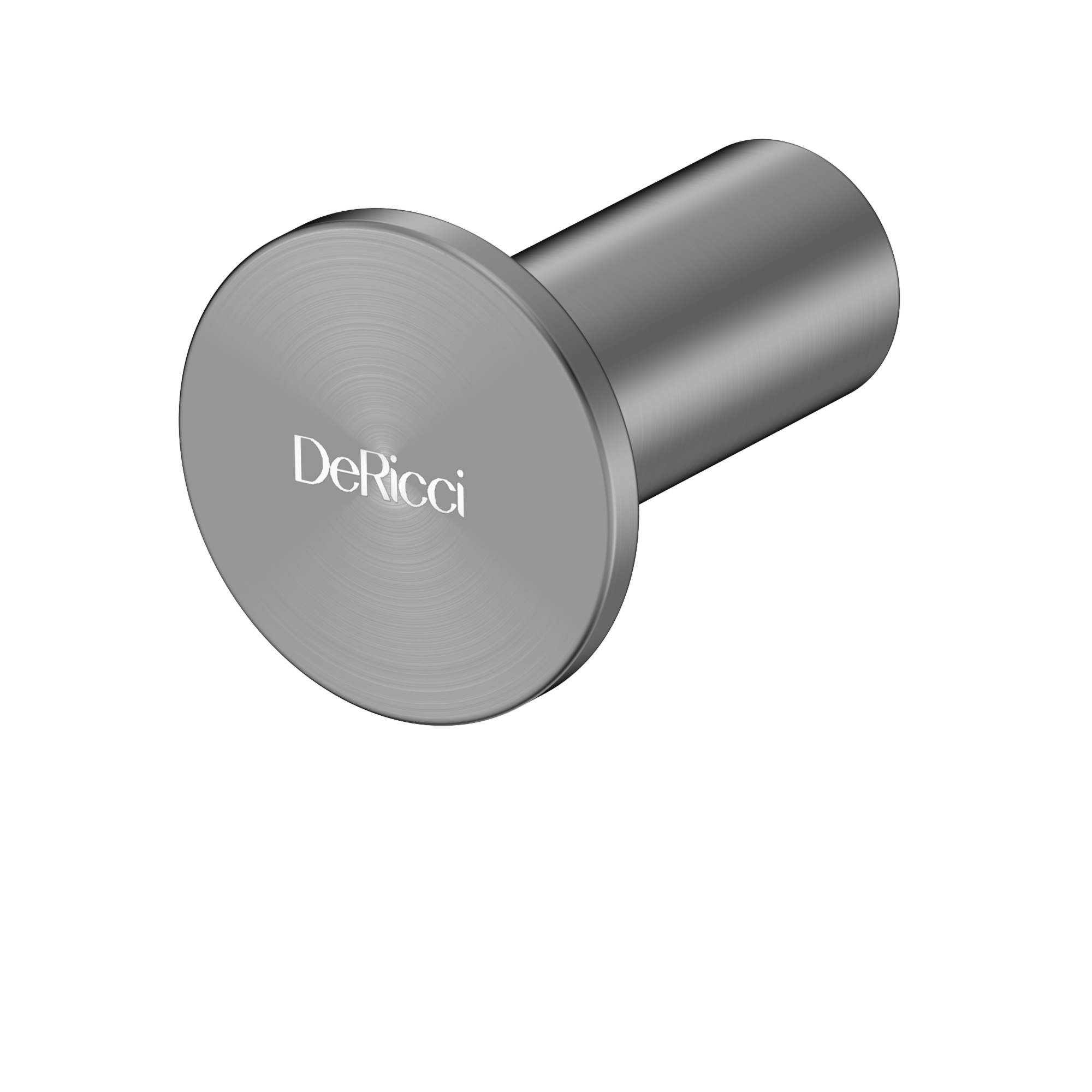 For a sophisticated, moody edge, choose the DeRicci Gunmetal Robe Hook. The dark grey, glossy metallic finish offers a striking alternative to chrome, perfect for industrial or luxury modern interiors.