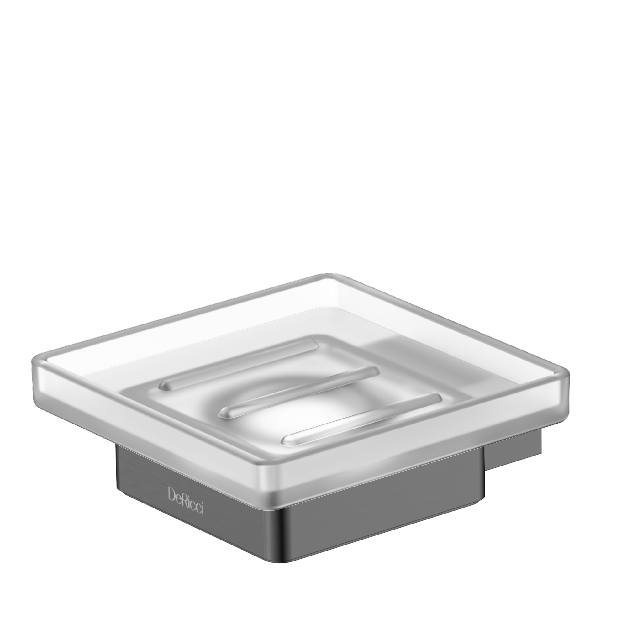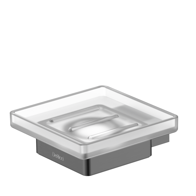 For a finish that exudes luxury and drama, choose the DeRicci Polished Black Soap Holder. Also known as “Black Chrome,” the reflective dark metal creates a stunning jewel-like effect around the frosted glass tray.